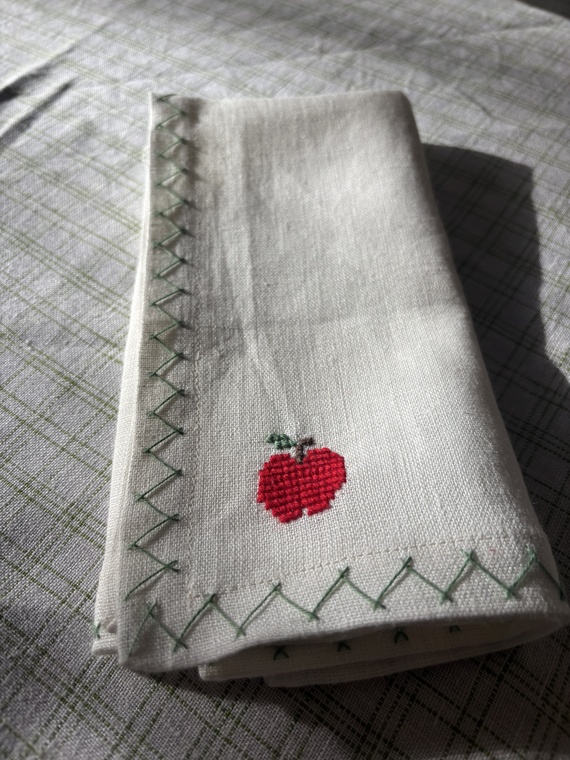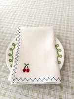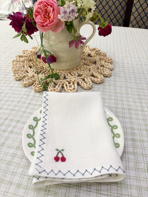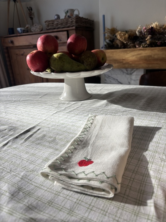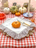 A neutral-toned linen napkin with a Indian cotton frill in check pattern in orange and soft blue on a natural background.