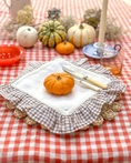 A neutral-toned linen napkin with a Indian cotton frill in check pattern in orange and soft blue on a natural background.
